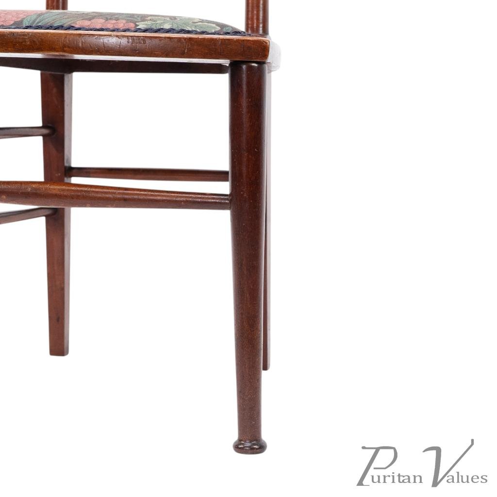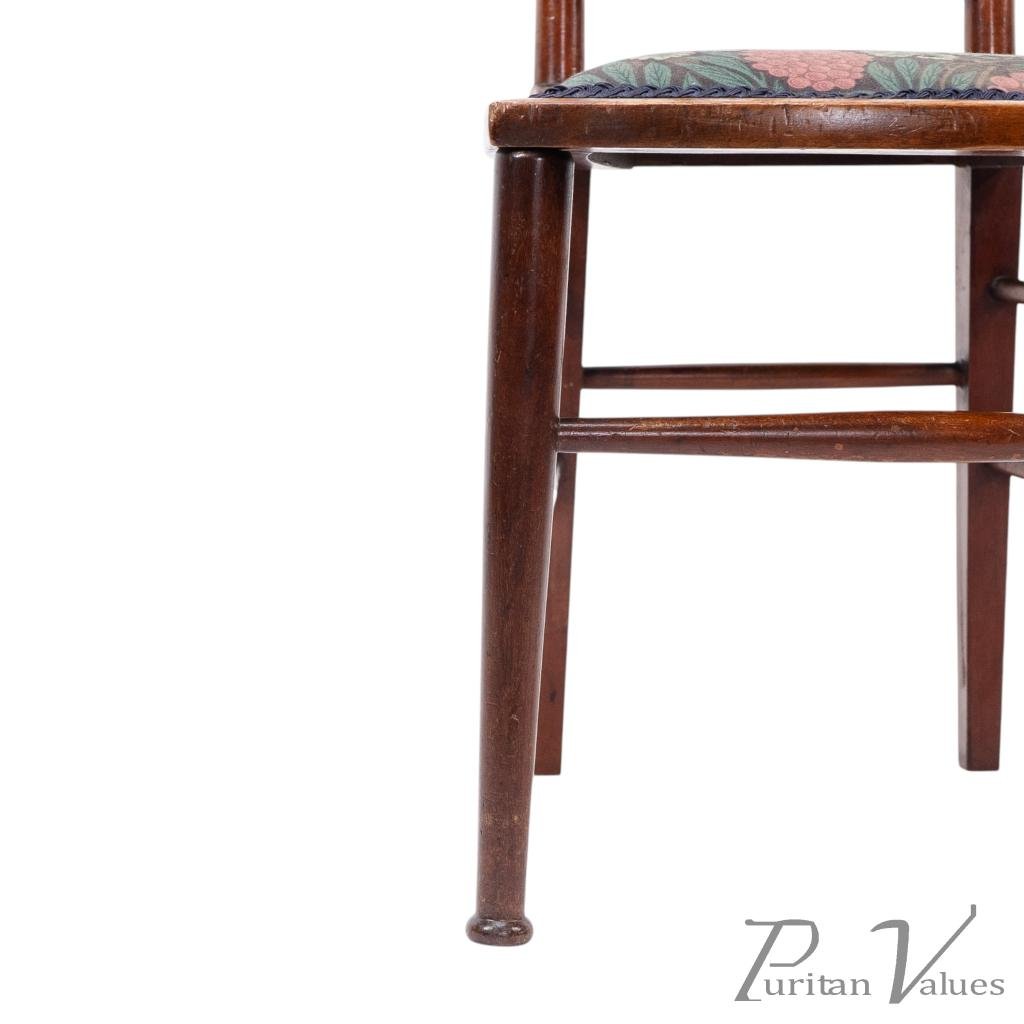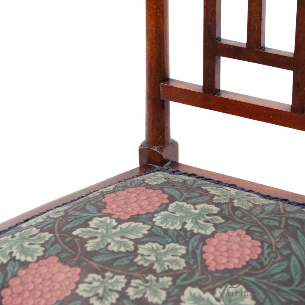 By William Birch for Liberty and Co, a walnut side chair designed by E. G. Punnett, aligned to the Arts and Crafts movement (1880–1910), c.1901. The tall rectangular back has a narrow top rail set with two circular floral medallion inlays in contrasting sycamore and boxwood, divided by square apertures, above an open three-bar panel. A trapezoidal upholstered seat with grape-and-leaf patterned textile sits on round legs with twin side stretchers and a single front and rear stretcher.