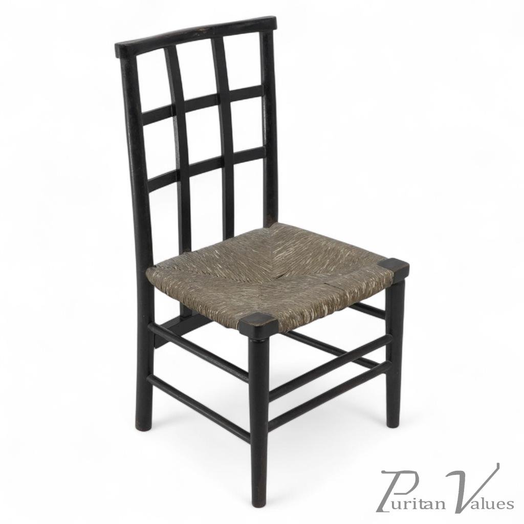 This Arts and Crafts beech child’s chair by William Birch for Liberty & Co. was produced around 1900 and demonstrates the unity of form and craft that defined the Arts and Crafts movement (1880–1910). The ebonised frame, with lattice back and square legs, supports a hand-rushed seat of traditional weave, its geometry both functional and decorative.