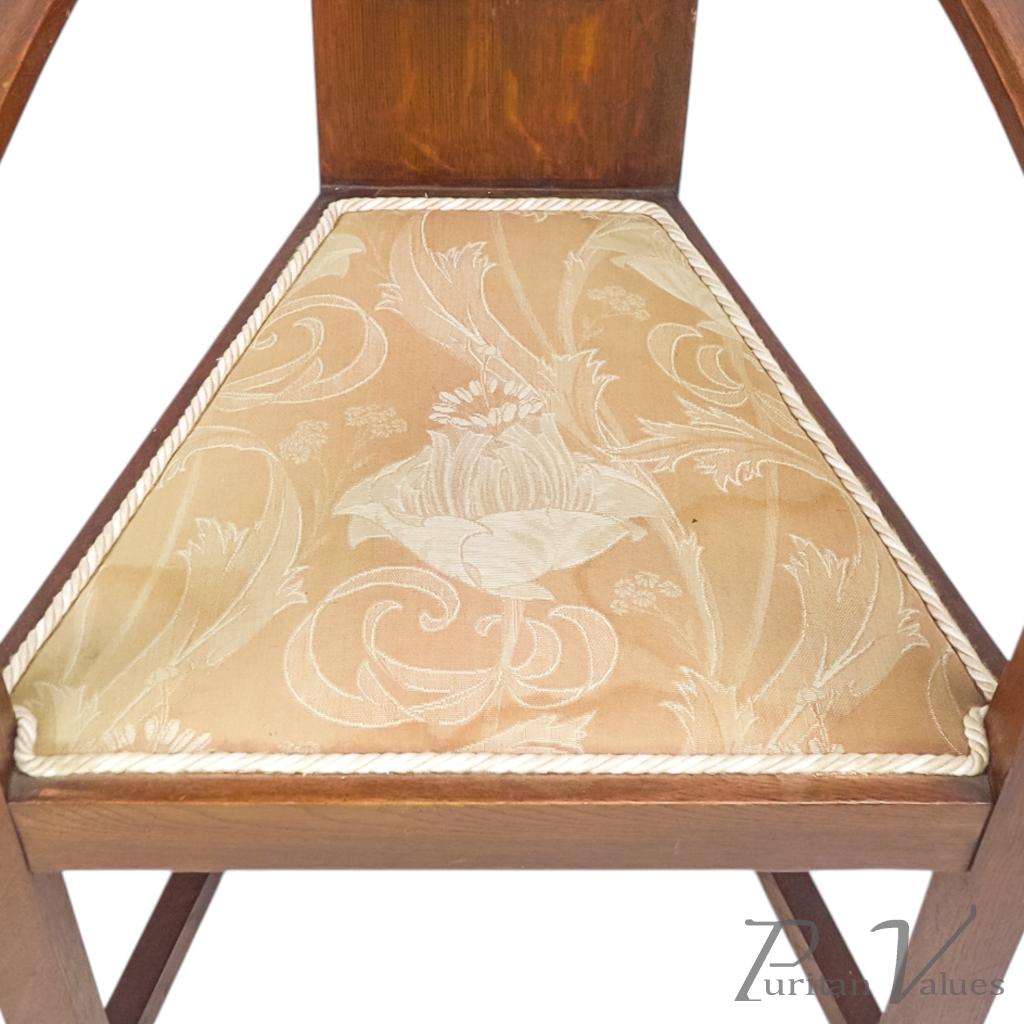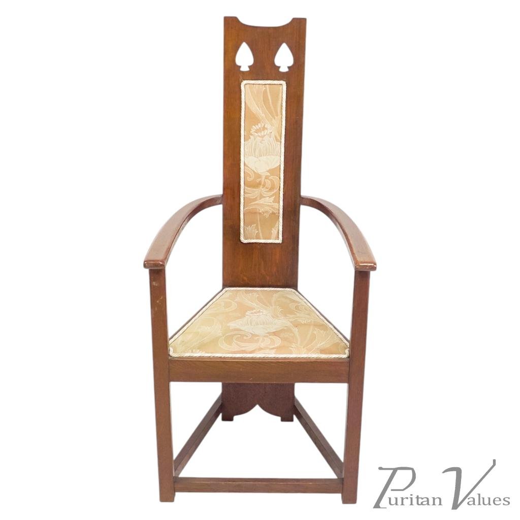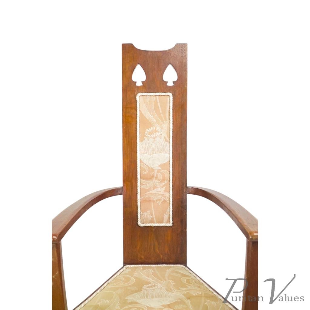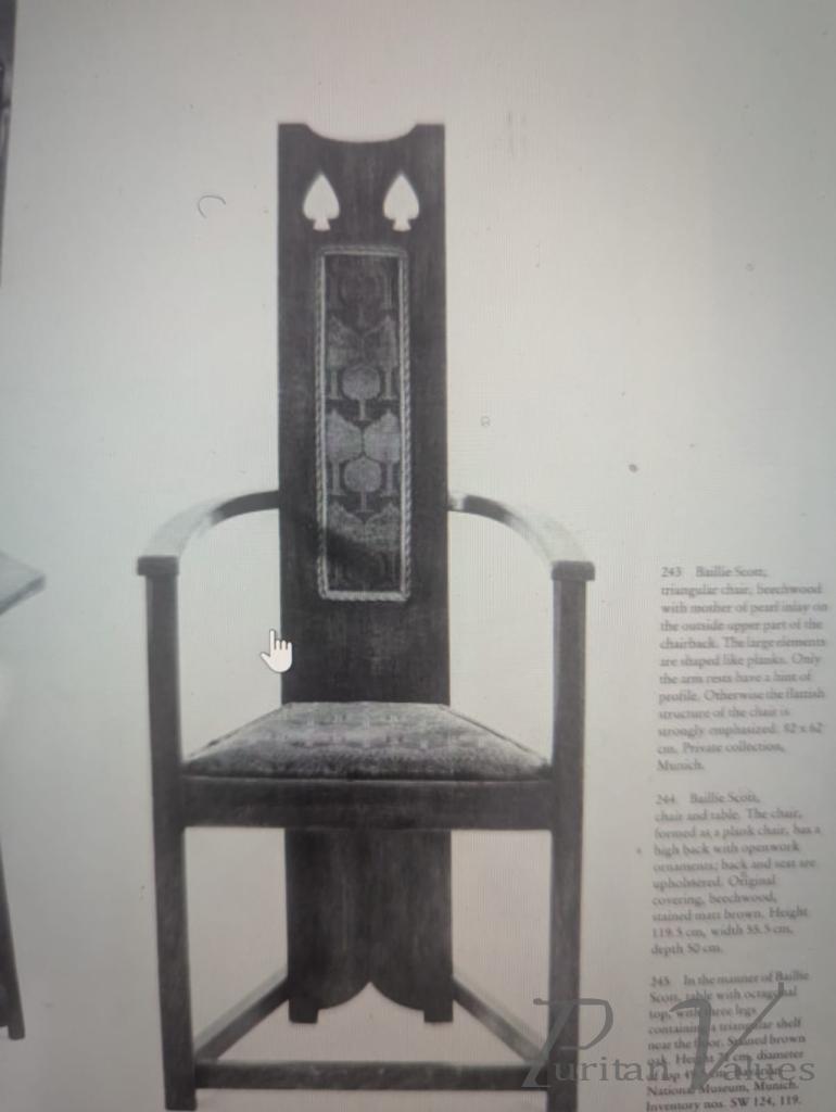 Although there is no firm evidence that these were designed by M. H. Baillie Scott, the planked full-length backs, stylised fretwork tree designs to the top, triangular seats, and low floor stretchers all strongly point to his hand.