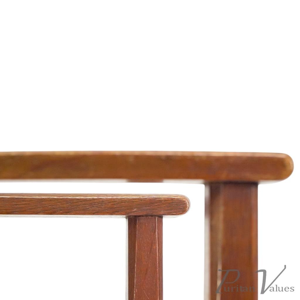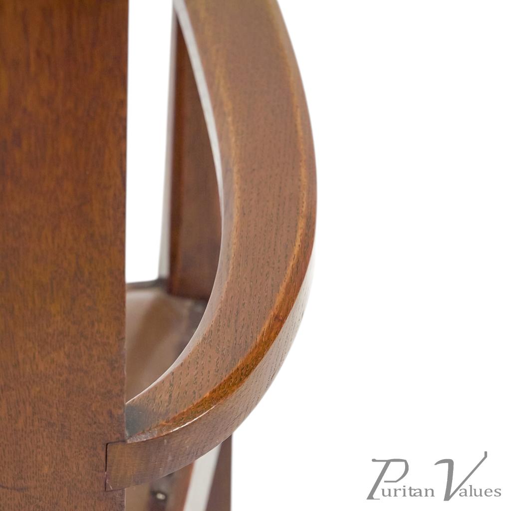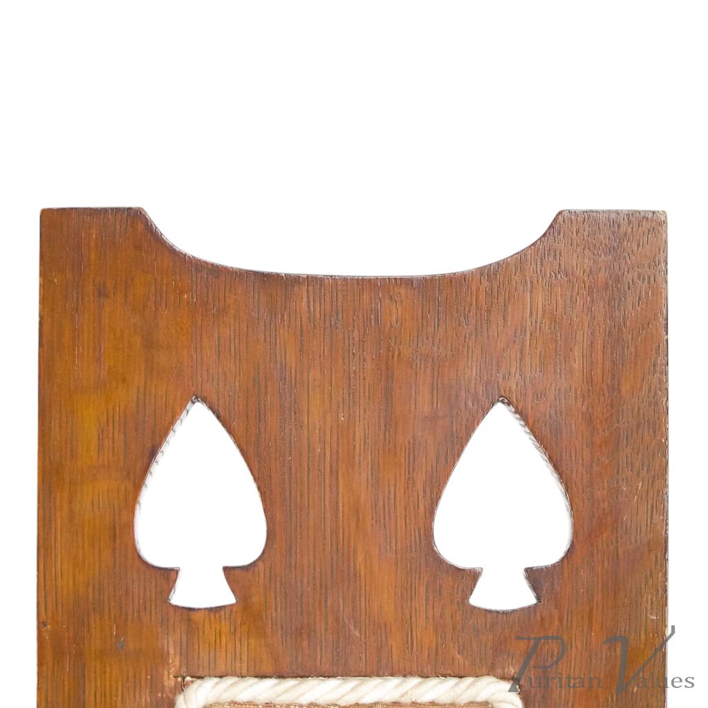 Although there is no firm evidence that these were designed by M. H. Baillie Scott, the planked full-length backs, stylised fretwork tree designs to the top, triangular seats, and low floor stretchers all strongly point to his hand.