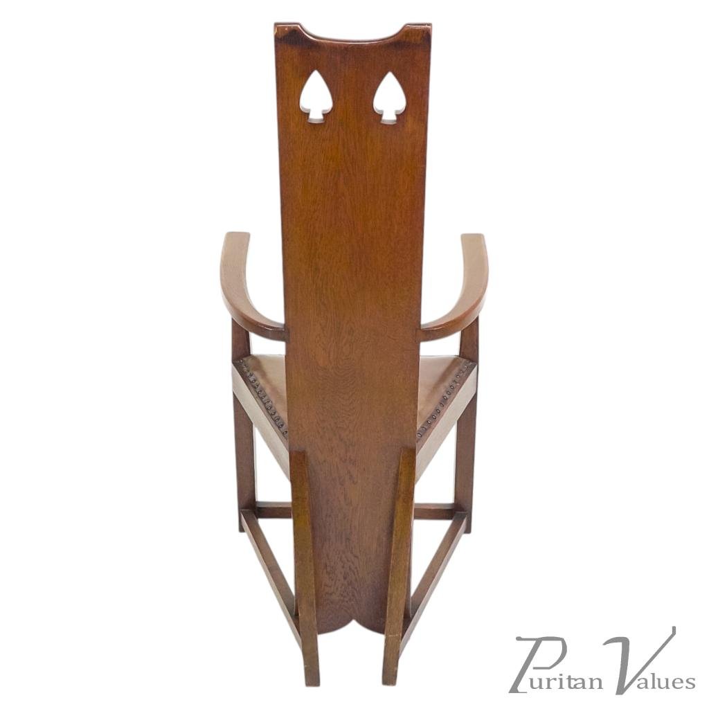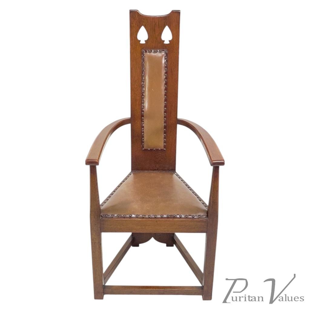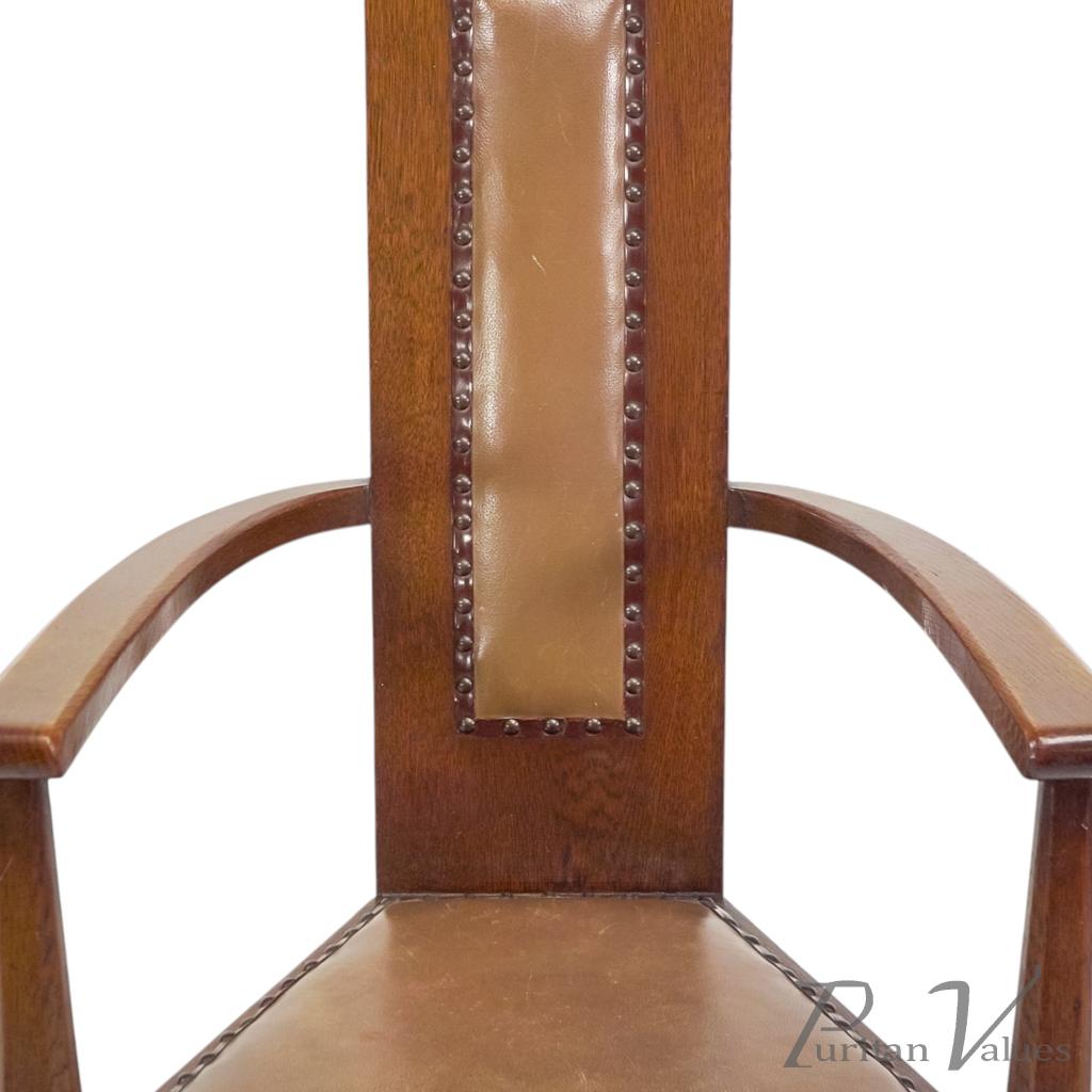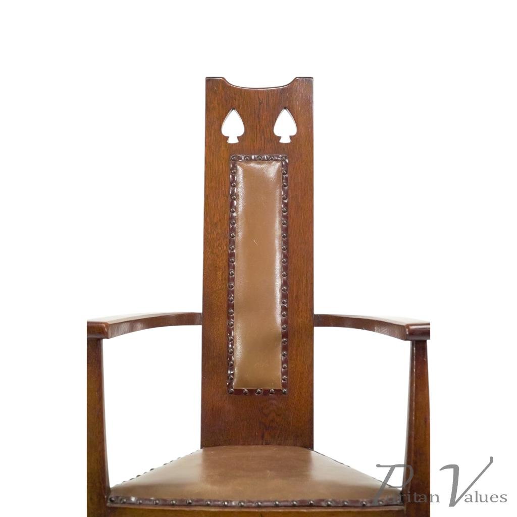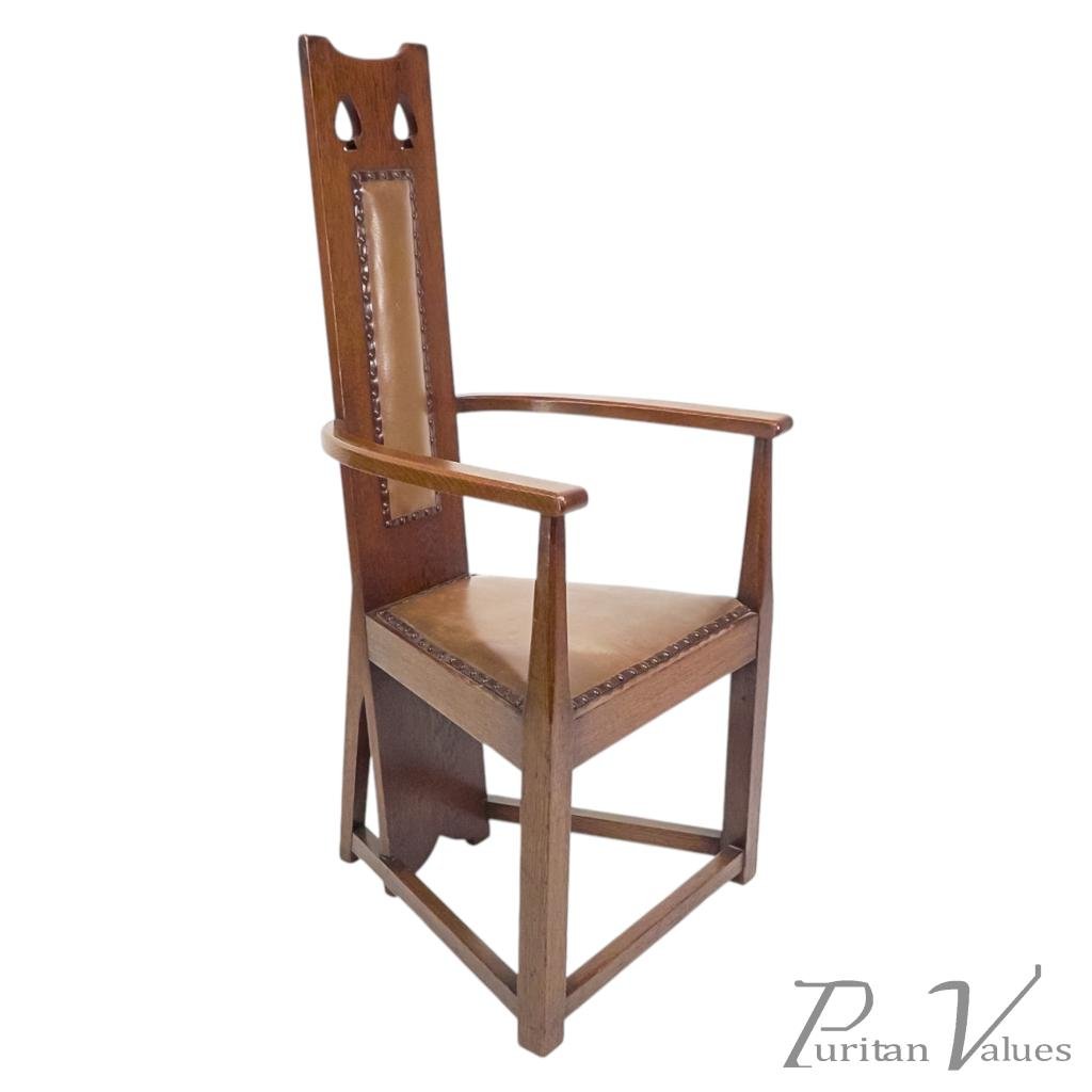 M. H. Baillie Scott, attributed. Three Arts and Crafts high-back oak armchair with a tall back rising to a pierced top rail, constructed in quarter-sawn oak. Two examples have leather-inset backs, while one example has a fabric-inset back.
