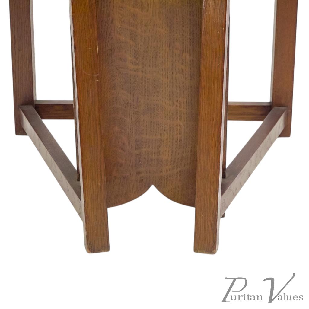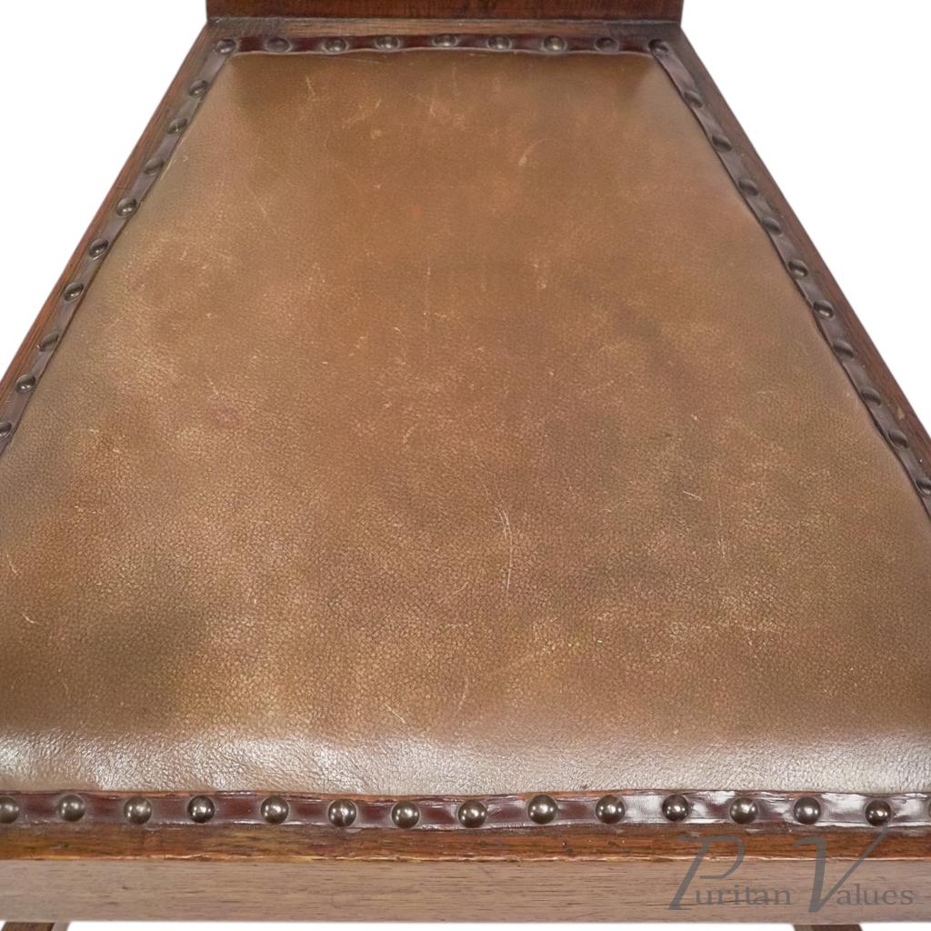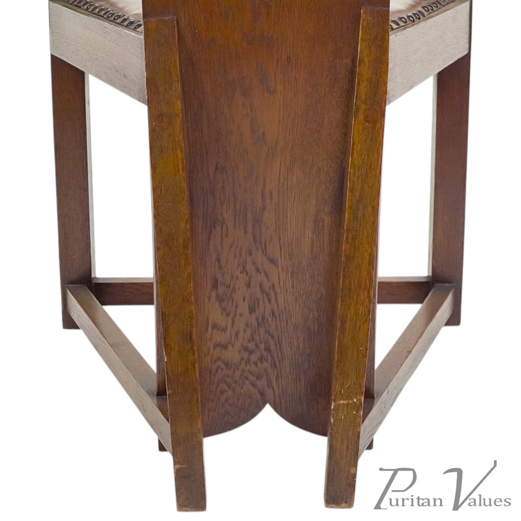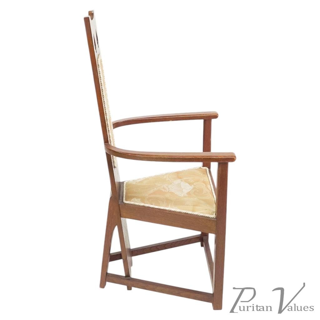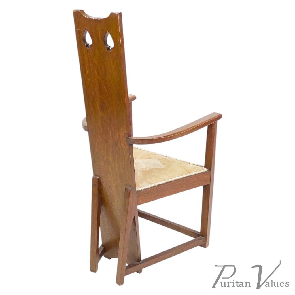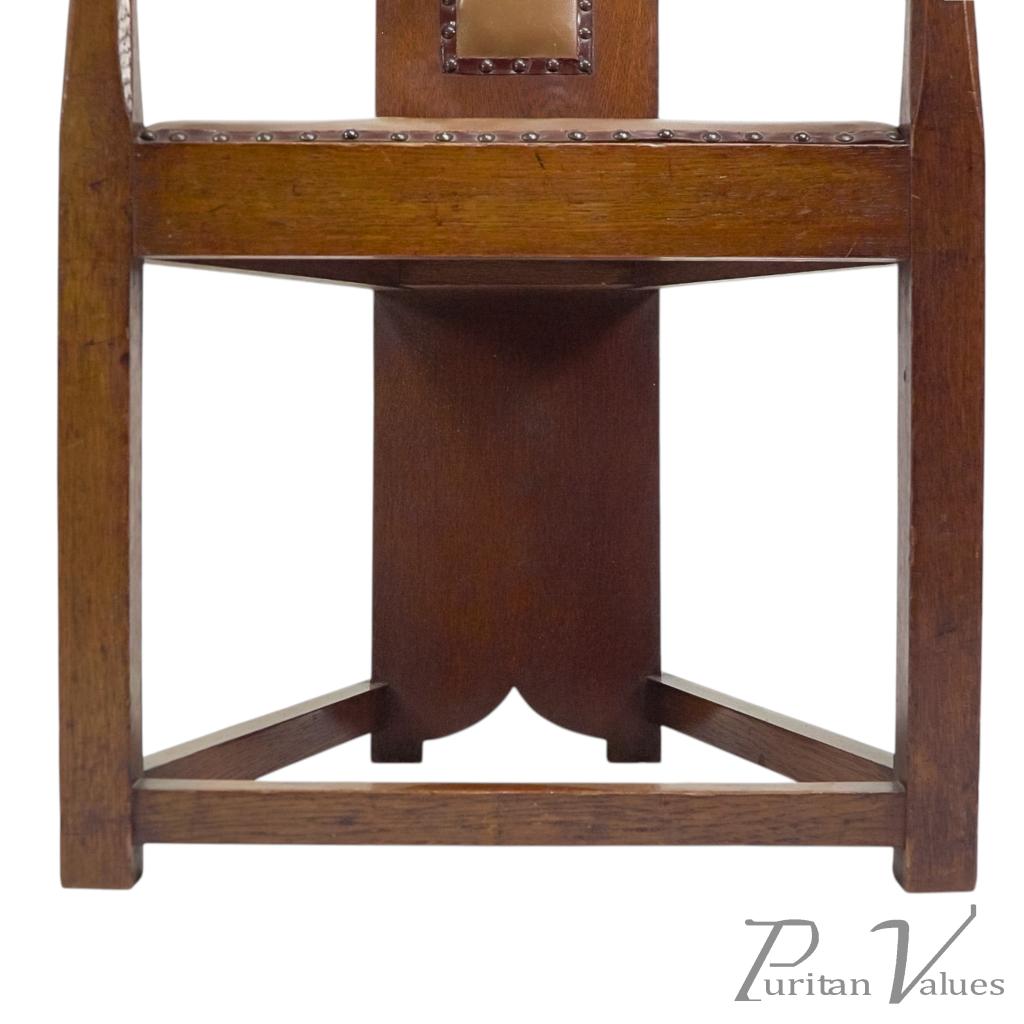 M. H. Baillie Scott, attributed. Three Arts and Crafts high-back oak armchair with a tall back rising to a pierced top rail, constructed in quarter-sawn oak. Two examples have leather-inset backs, while one example has a fabric-inset back.