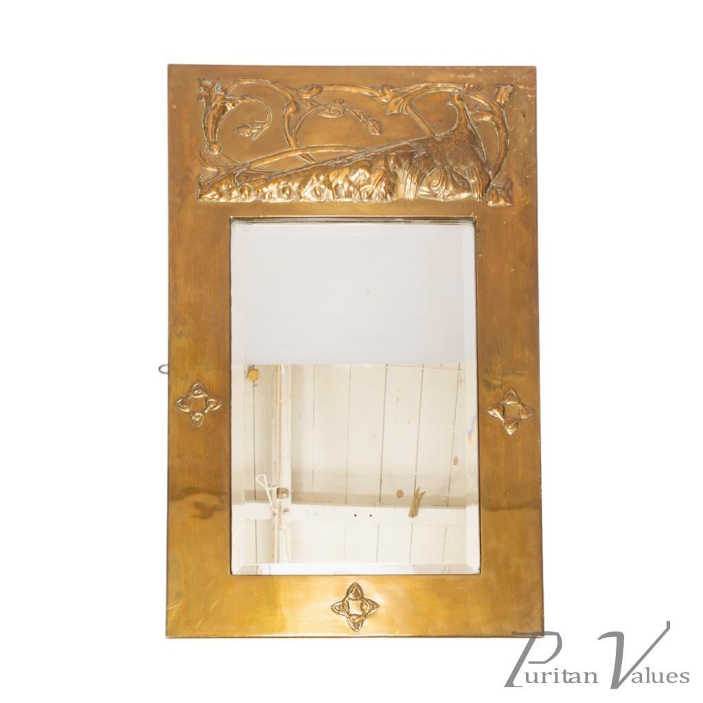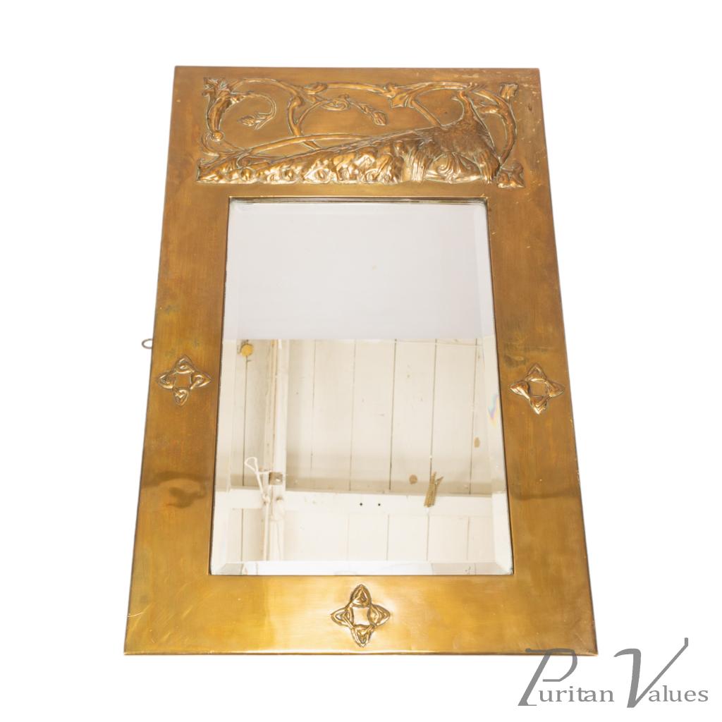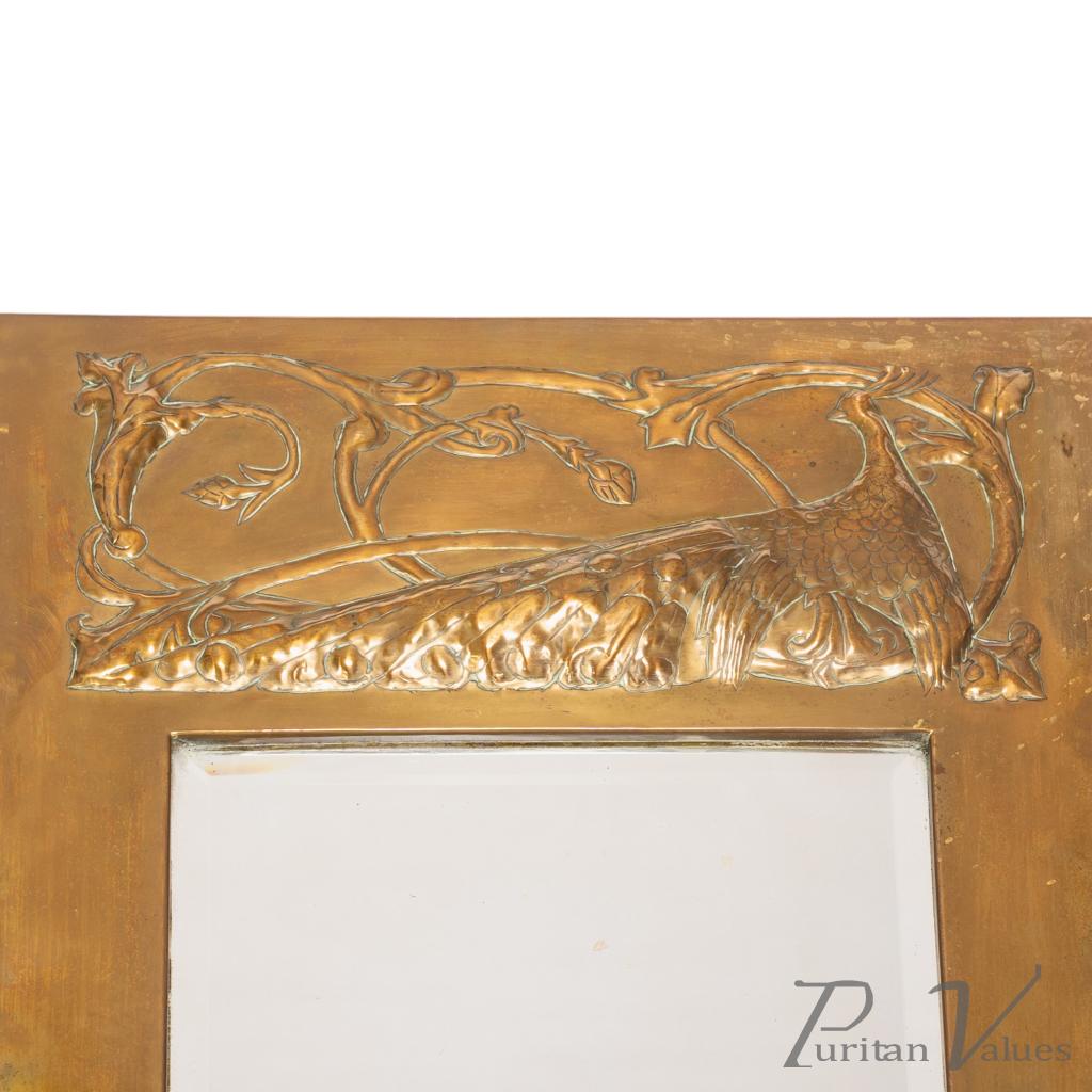 Margaret Gilmour, attributed. An Arts and Crafts Glasgow School brass mirror with hand-hammered peacock and floral decoration to the top, and Celtic interlacing to the sides and base.