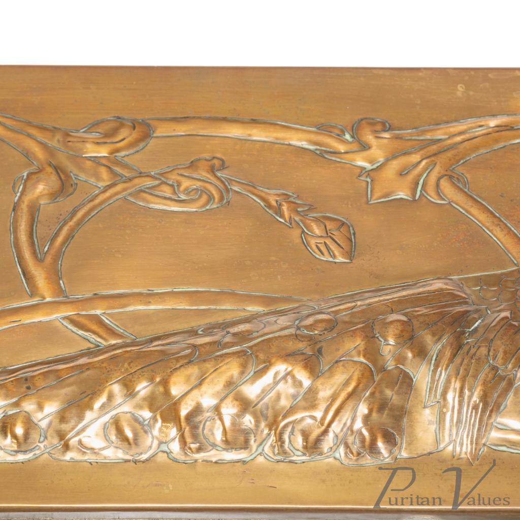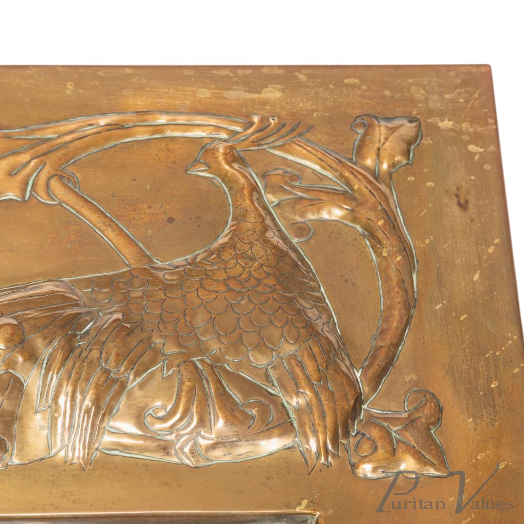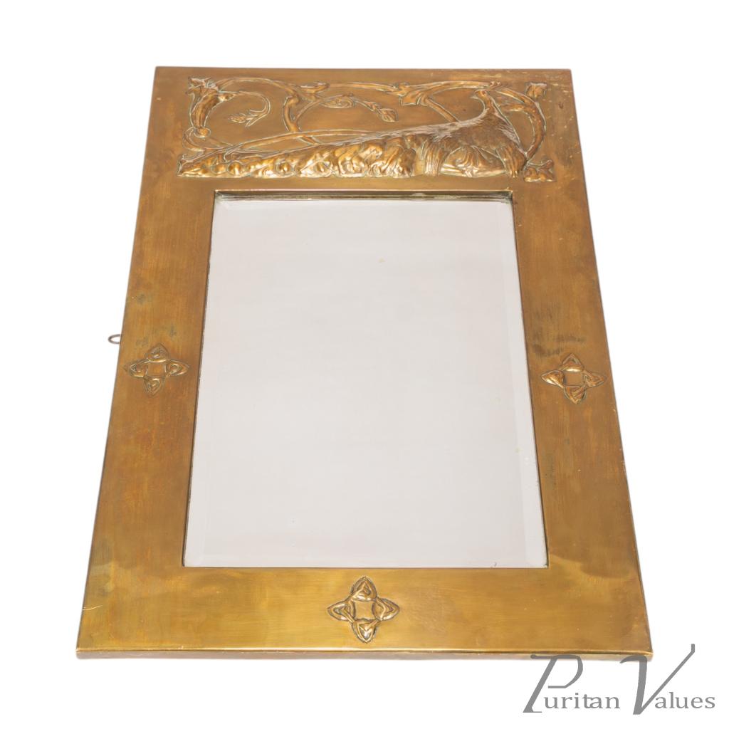 Margaret Gilmour, attributed. An Arts and Crafts Glasgow School brass mirror with hand-hammered peacock and floral decoration to the top, and Celtic interlacing to the sides and base.