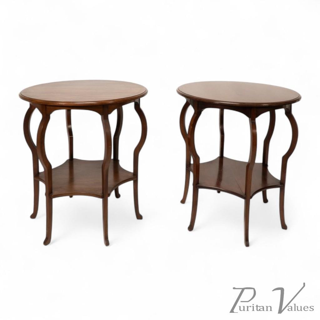 With circular top and shaped aprons below and fabulous shaped legs united by a shaped lower shelf on little pad feet.