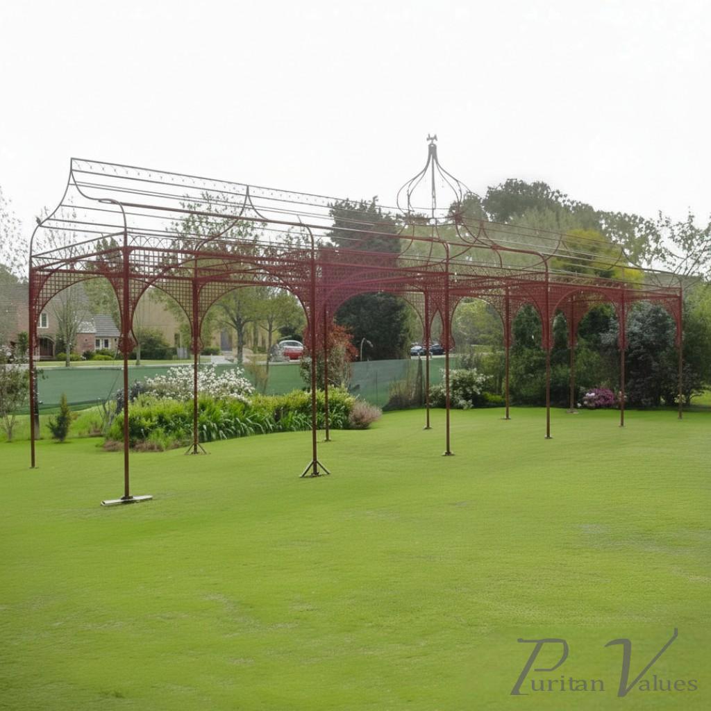 We have pre-drilled four holes to each foot plate so it can be bolted securely and safely to a concrete base. Alternately, large long stakes could be hammered down into a lawned garden. We had the pergola restored in Argentina before we shipped it back. The latter images show the guys hand-painting all of the parts with rust-resisting red oxide primer undercoat paint. It was sandblasted back to the metal before it was painted red.