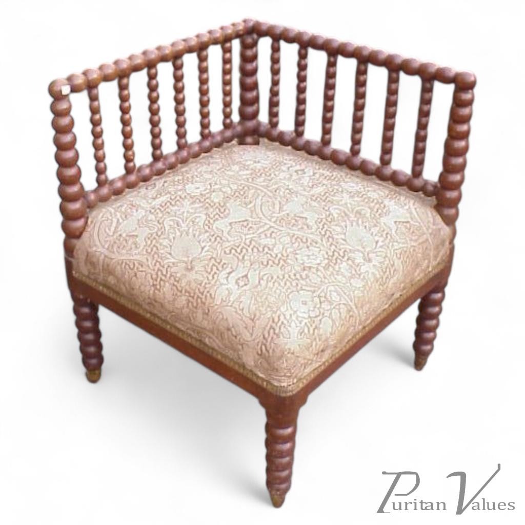 A good quality bobbin turned corner chair of generous proportions attributed to Morris and Co with original fabric to seat and original brass castors. Height 30", Width of seat 24" x 24". Circa 1875.