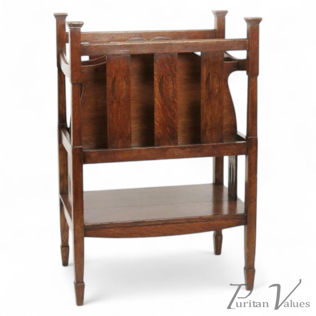 A rare Arts and Crafts oak canterbury by Shapland and Petter with upper extending square cap supports and half moon stylised cut-outs to each side with shaped segmented paper racks. The square shaped legs united by a lower shelf with sweeping shaped aprons below terminating on spade feet. Height 27" Depth 13" Width 18". Circa 1900.