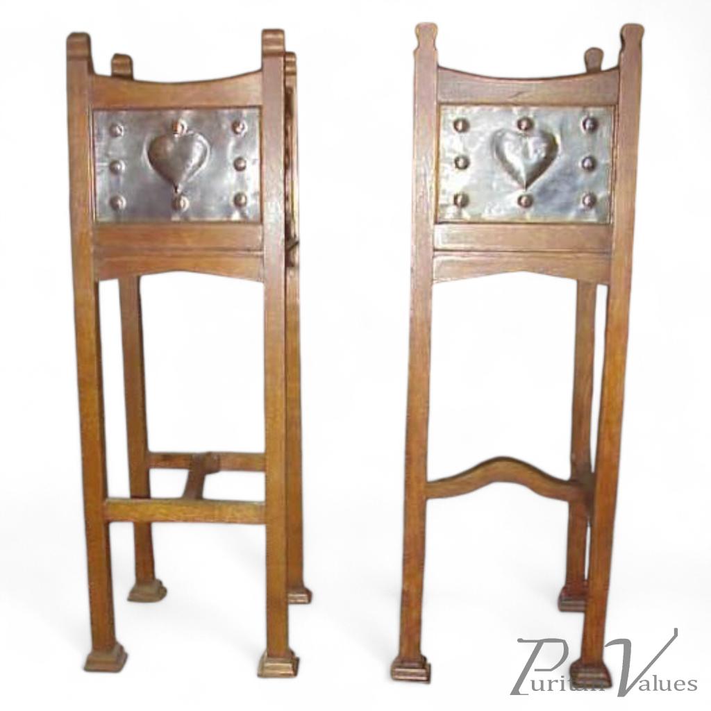 An Arts and Crafts oak plant stand with repousse copper heart detailed panels by Shapland and Petter, one sold one in stock. Height 36", Width 10 1/2" Square. Circa 1900.