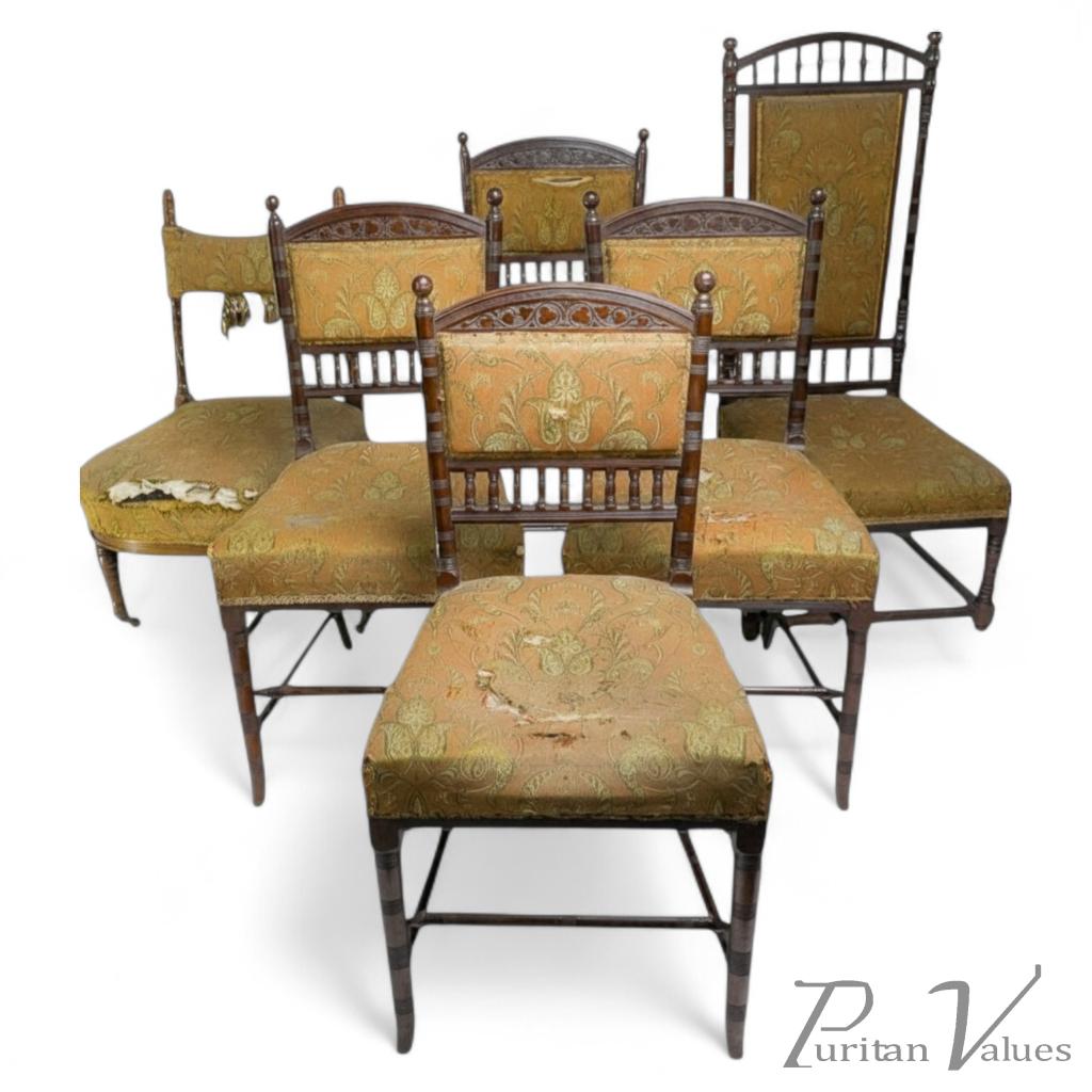 A museum-quality rosewood part drawing room suite of two nursing and four side chairs. Comprising: four side or dining chairs, a high-back nursing chair, and a low-back nursing chair. With ring-turned galleries, uprights, and supports, still retaining the original Paisley pattern silk brocade upholstery (some losses), identical to those illustrated in the 1871 Collinson & Lock catalogue (see last image). Also see Gere, Charlotte and Whiteway, Michael, Nineteenth-Century Design, London, 1993, p. 283.