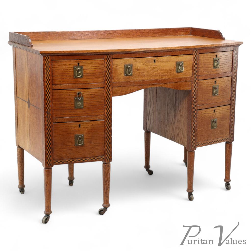 An Arts and Crafts bow fronted kneehole twin pedestal desk with chequered inlay, featuring quality hand hammered brass handles, and turned legs on original castors.