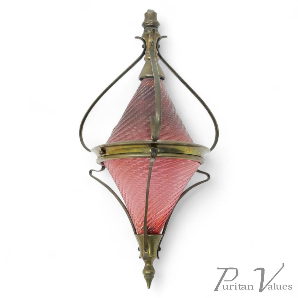 W.A.S Benson. A rare double conical hanging lamp with double rose tinted cut glass swirl design shades, embraced within a simple, fluid enclosure. Measurements: H 11" W 6.5"