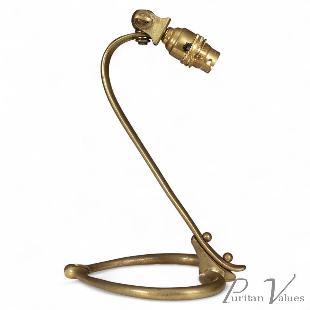 A brass table lamp designed by W. A. S. Benson, formed with the sculptural simplicity characteristic of the Arts and Crafts Movement. The curved tubular stem rises from a heart-shaped base, a recurring motif in Benson’s lighting designs that balanced geometry with organic form. The lamp retains its original brass finish and adjustable shade holder, showing fine craftsmanship in both proportion and joinery. Benson’s designs exemplified the union of artistry and utility that defined the reformist ideals of late-Victorian decorative design.