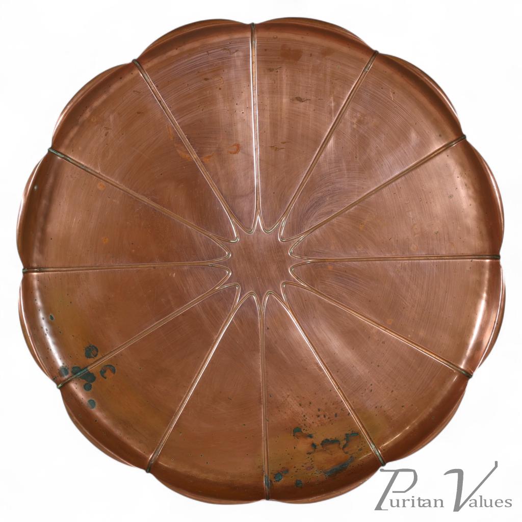 A large copper lily pad tray, Arts and Crafts movement, by W. A. S. Benson. Circular form with pressed radial veins and petal-shaped scalloped edge.