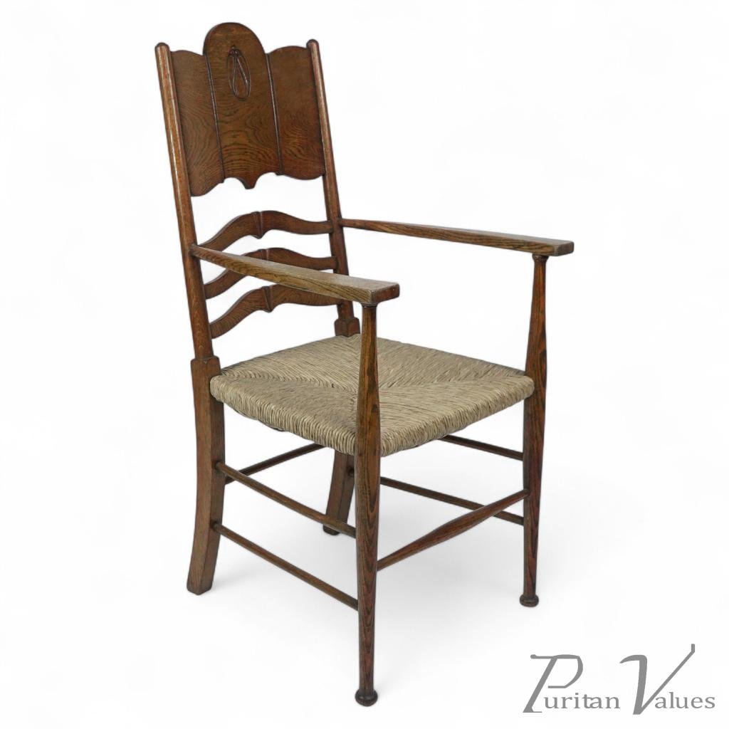 An Arts & Crafts oak armchair with Glasgow style floral carving to the backrest. This chair has been totally restored and had new rush professionally laid to the seat.