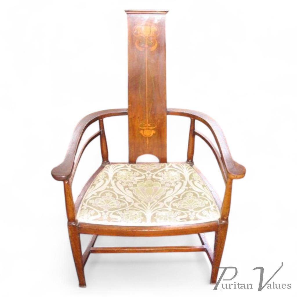 An inlaid mahogany armchair with original fabric to the seat made by William Birch of High Wycombe and probably retailed by LandCo. Circa 1900.