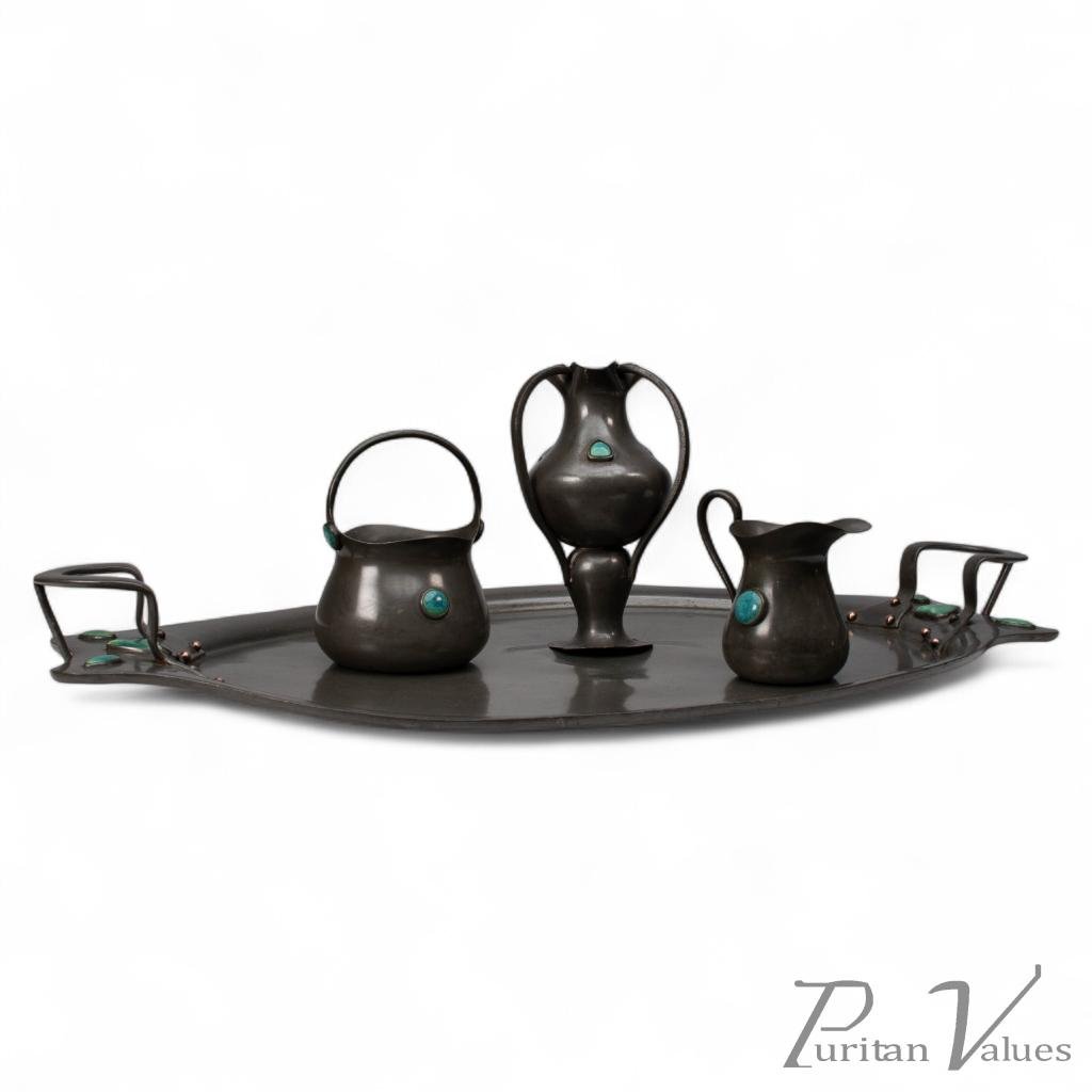 An Arts and Crafts tea set consisting of a posy holder, milk and sugar jug, and a large tray. All inset with Ruskin jewels, all in perfect condition.