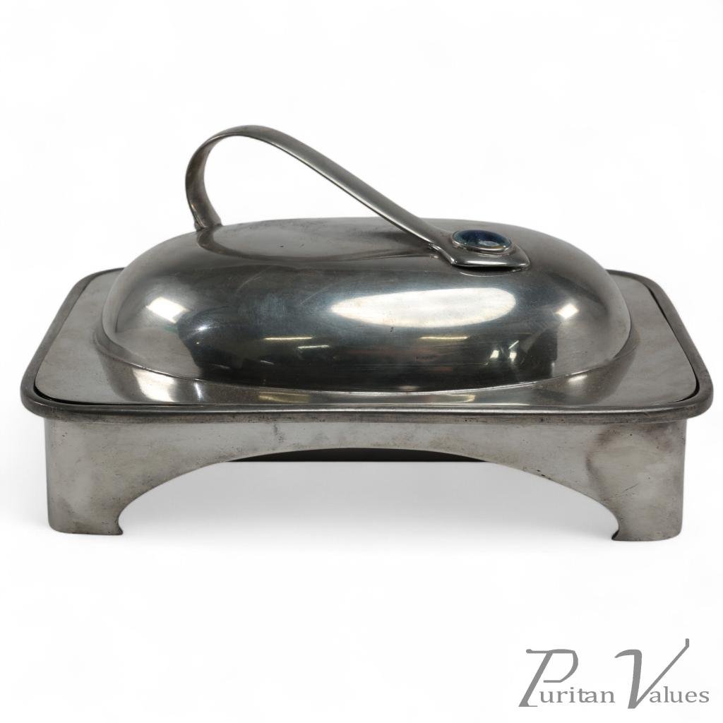 Probably made for Liberty & Co., London. An Arts & Crafts pewter muffin dish or food warmer, the whiplash handle sits astride the dome lid, and the handle foot is inset with a Ruskin Jewel. Inside, you have a separate warming tray that sits above hot water, keeping the food inside nice and warm.