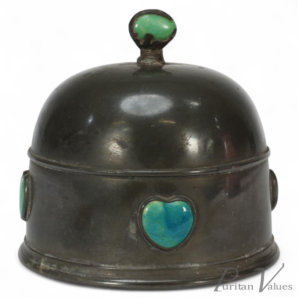 William Hutton, Probably for Liberty & Co., An Arts & Crafts Pewter Muffin Cover Inset with Ruskin Jewels