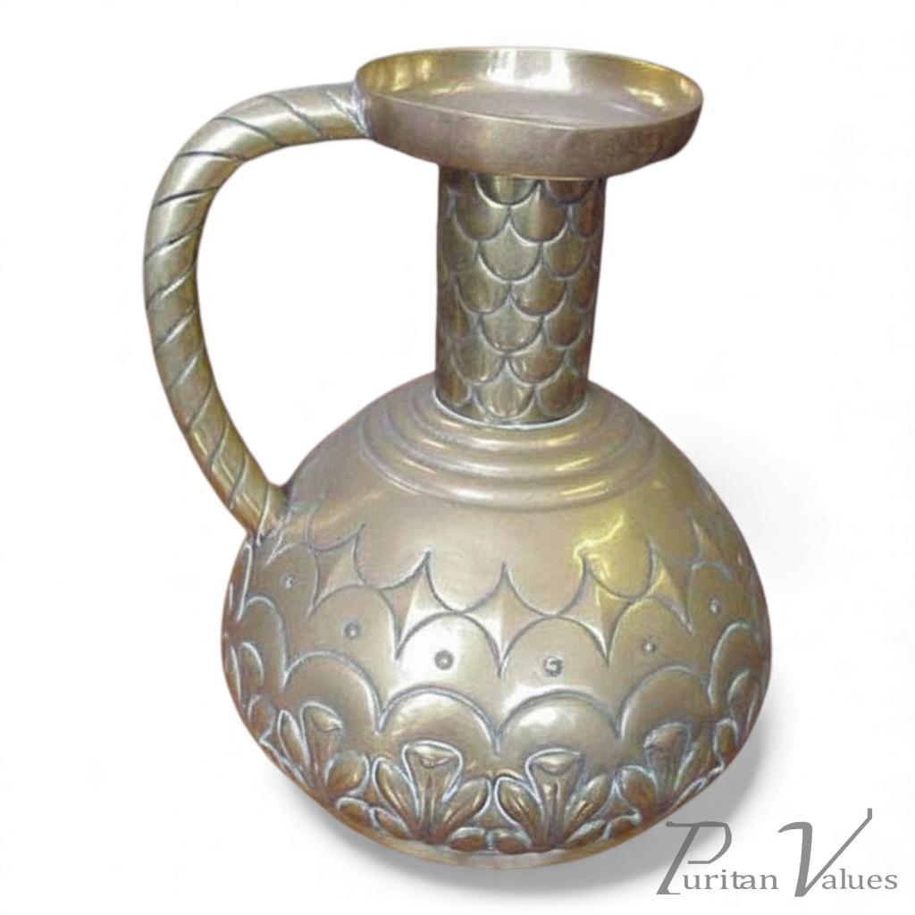 German, c.1910. A WMF brass jug with a rounded body, narrow neck and flared rim. The surface is pressed with a repeated foliate pattern and the handle cast in a rope-twist form. Produced in Germany around 1910, the jug reflects the workshop’s decorative metalware of the early twentieth century, showing the quality and precision typical of WMF’s domestic production.