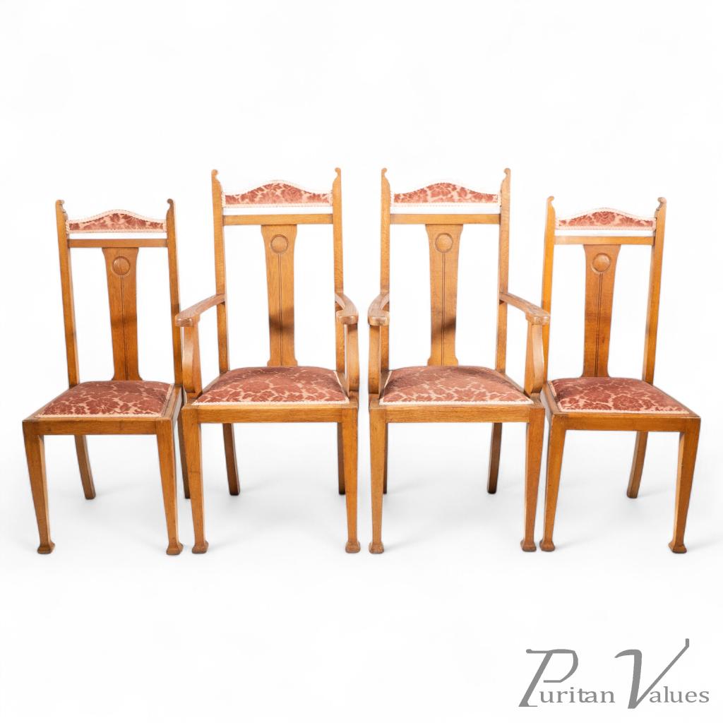 A set of six Arts and Crafts oak dining chairs with circular and line decoration to the backrest.