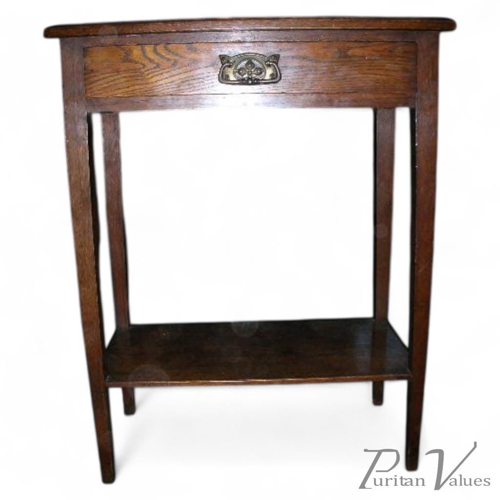 With wonderful stylised handle to the drawer, square tapering legs united by lower shelf.