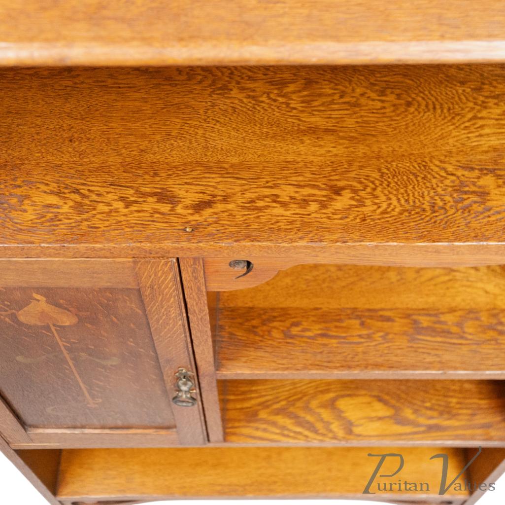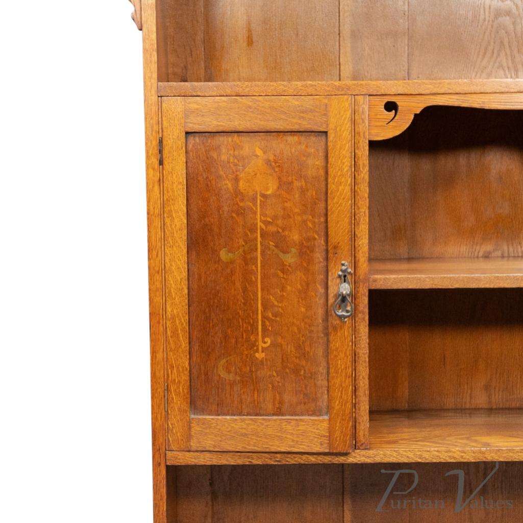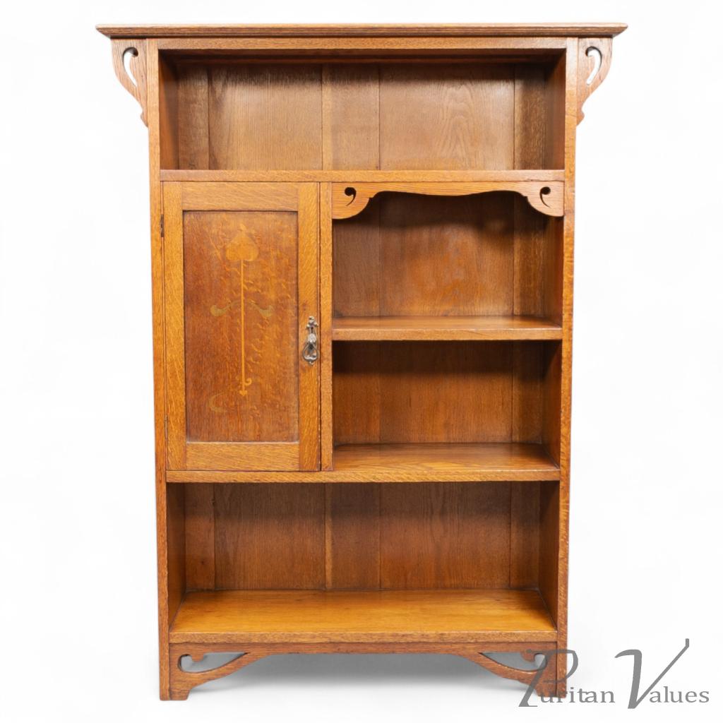 Wylie and Lochhead of Glasgow, in the style of. An Arts and Crafts oak open bookcase with a cupboard to the left. The cupboard door is inlaid with fine floral decoration, while the upright supports are enriched with decorative fretwork curls.