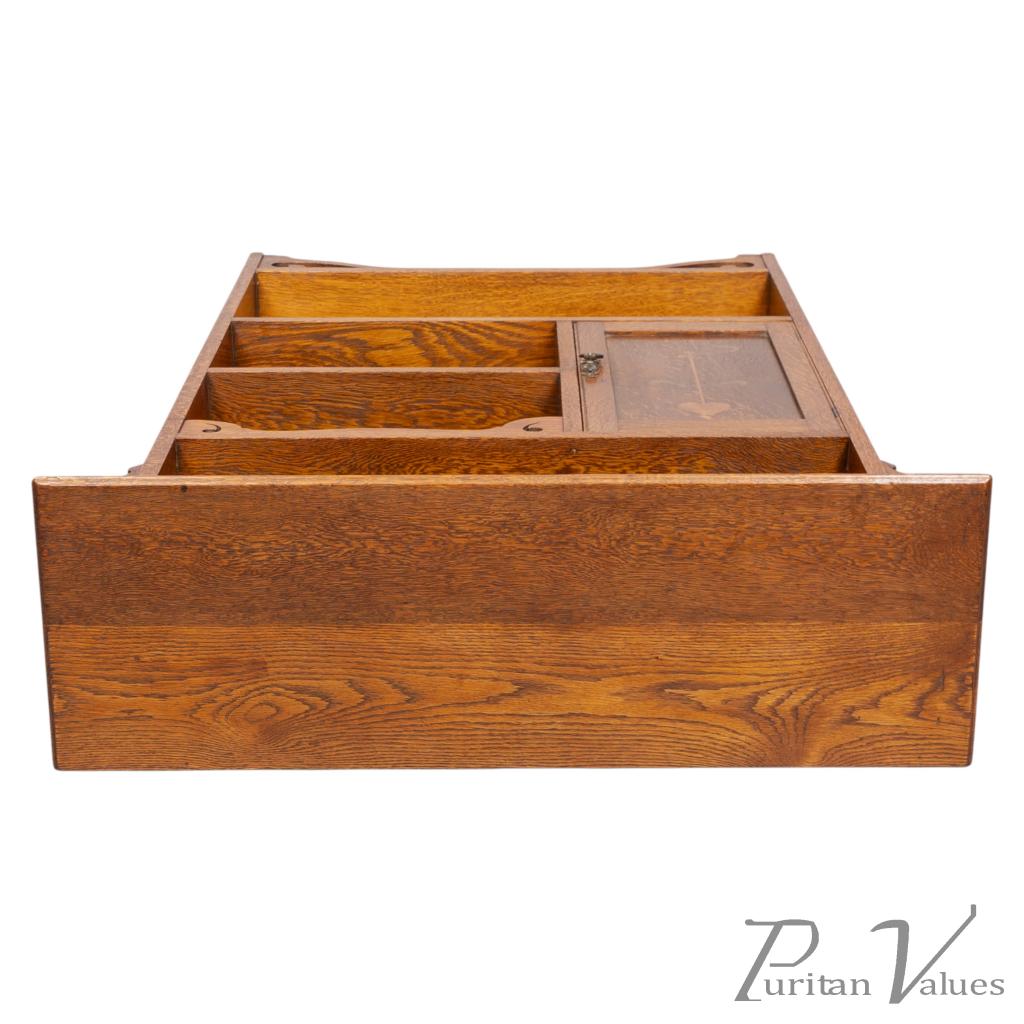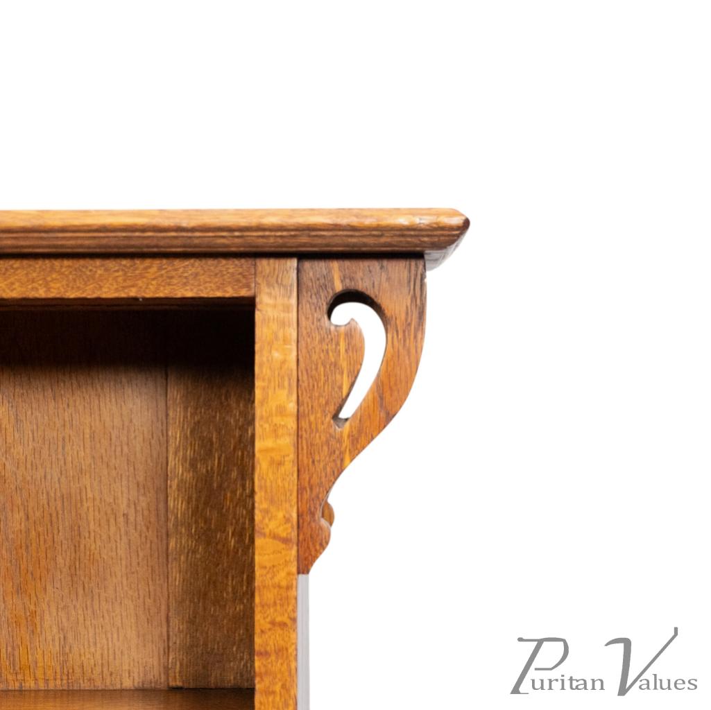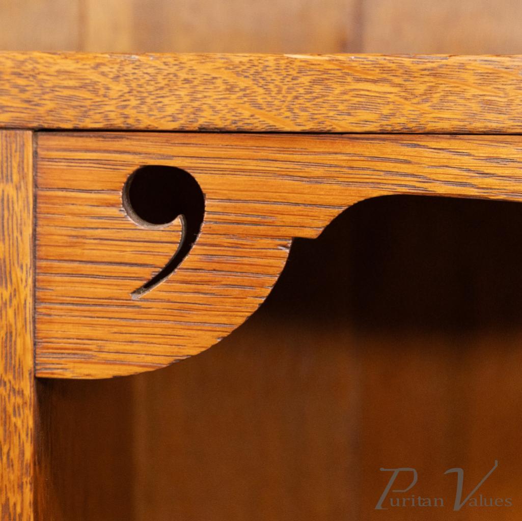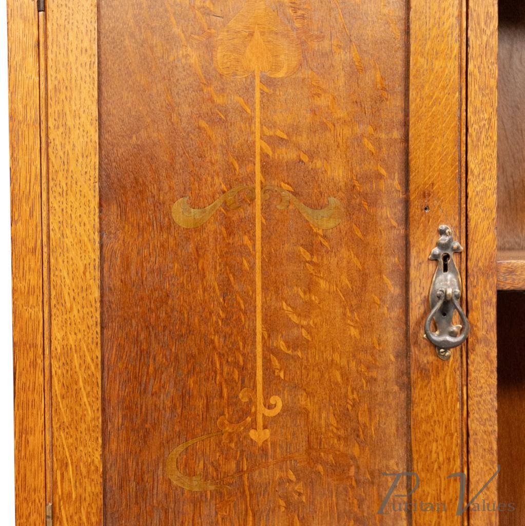 Wylie and Lochhead of Glasgow, in the style of. An Arts and Crafts oak open bookcase with a cupboard to the left. The cupboard door is inlaid with fine floral decoration, while the upright supports are enriched with decorative fretwork curls.