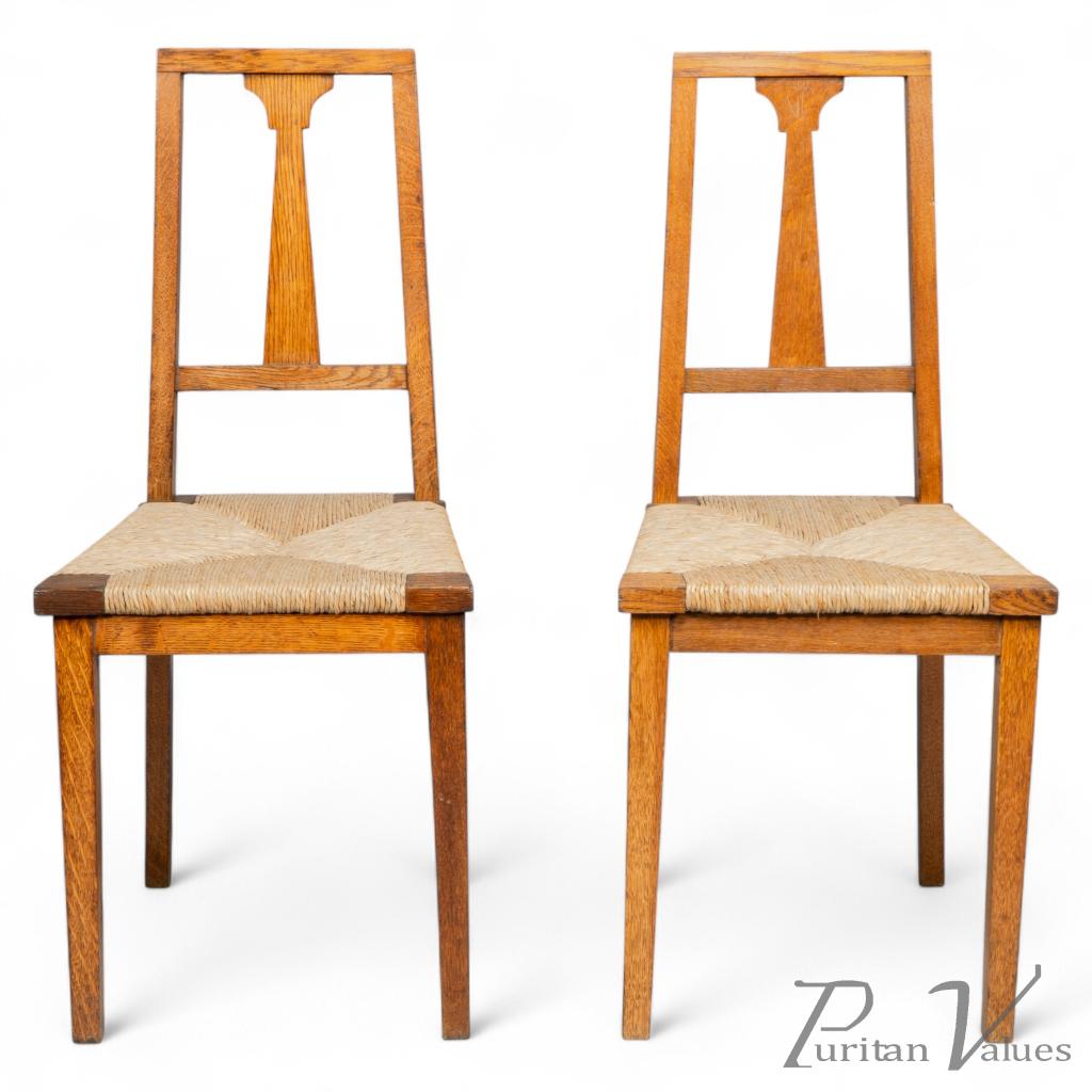 This pair of Arts & Crafts oak side chairs was produced by Wylie & Lochhead around 1905. Each chair is constructed with a tall rectangular back framing a broad central splat, the outline gently tapered towards the crest. The seats are finished with newly laid rush work, continuing the period preference for natural and durable materials in domestic furniture.